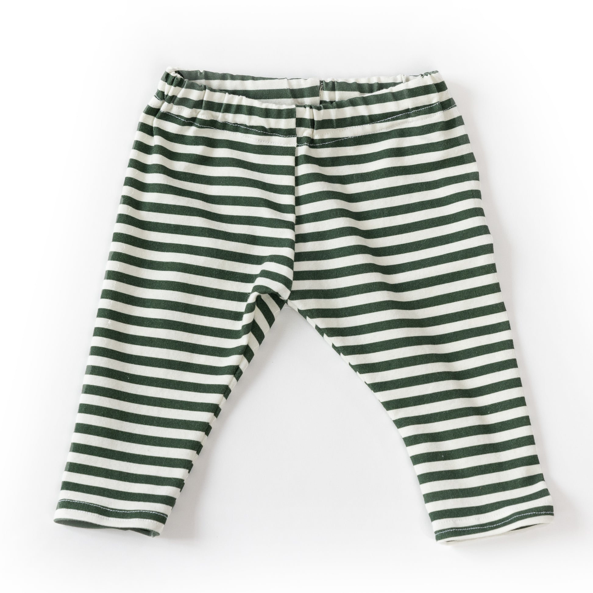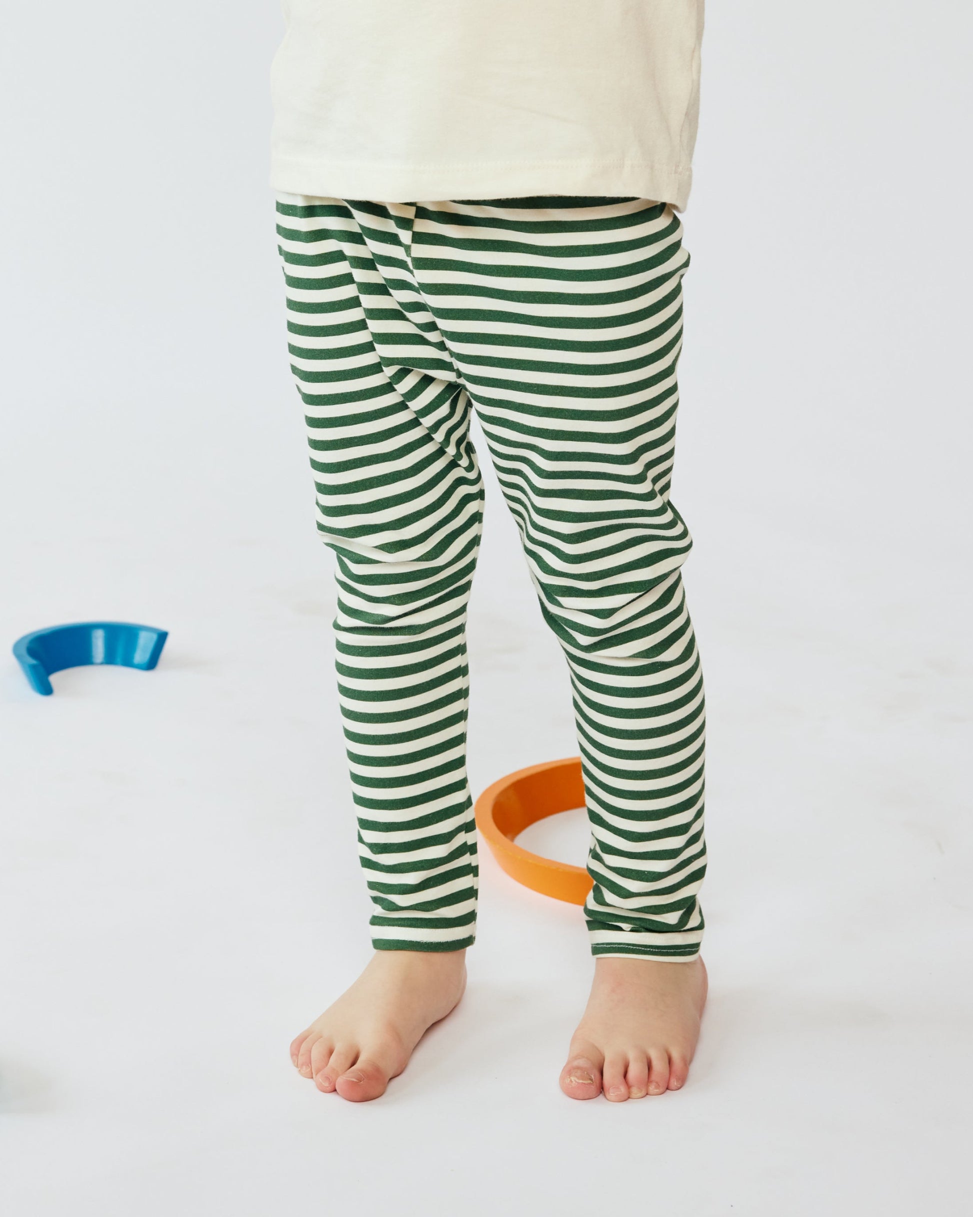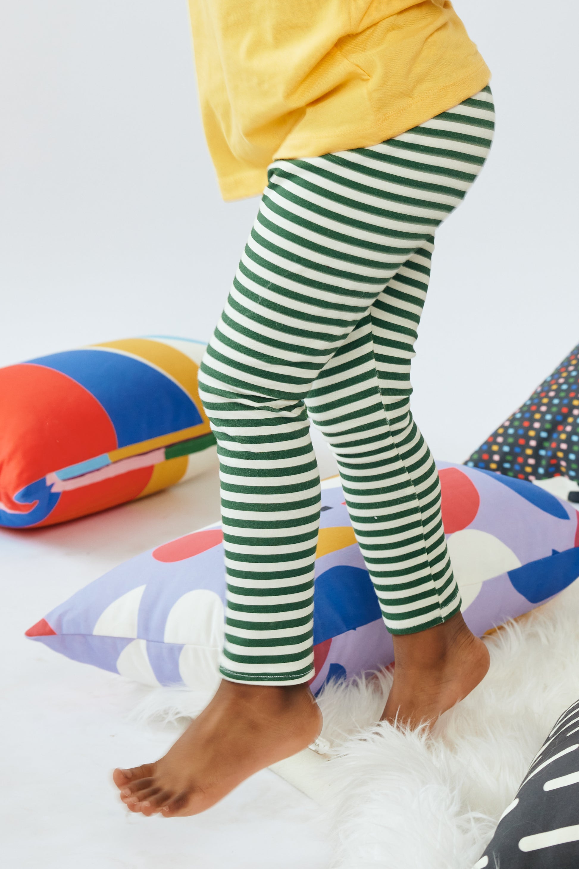 These organic green stripe leggings are easy to wear and literally go with anything. Completely gender-neutral because all colors are for everyone. These pants are part of our ongoing collaboration with Chicago brand Earth Cadets