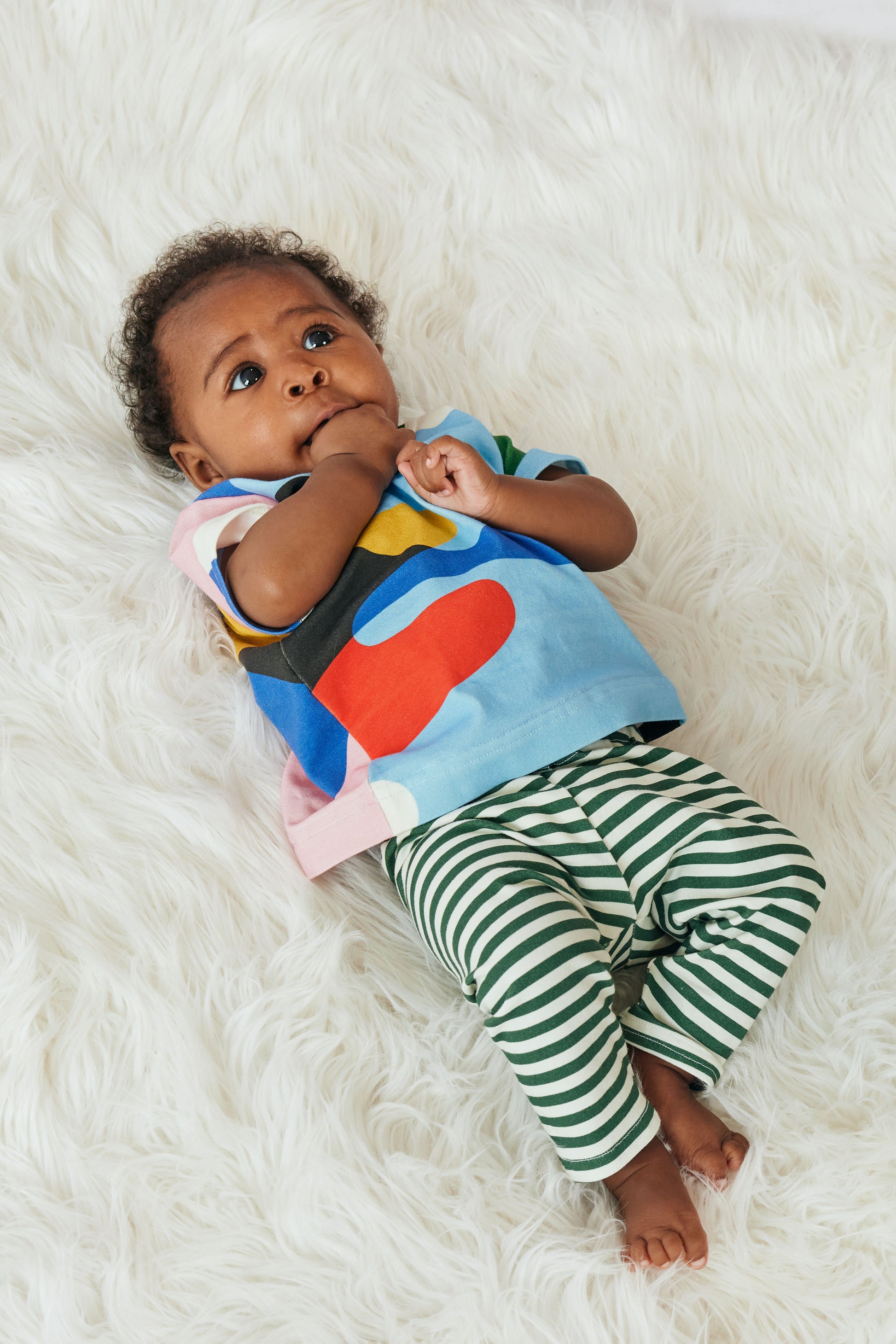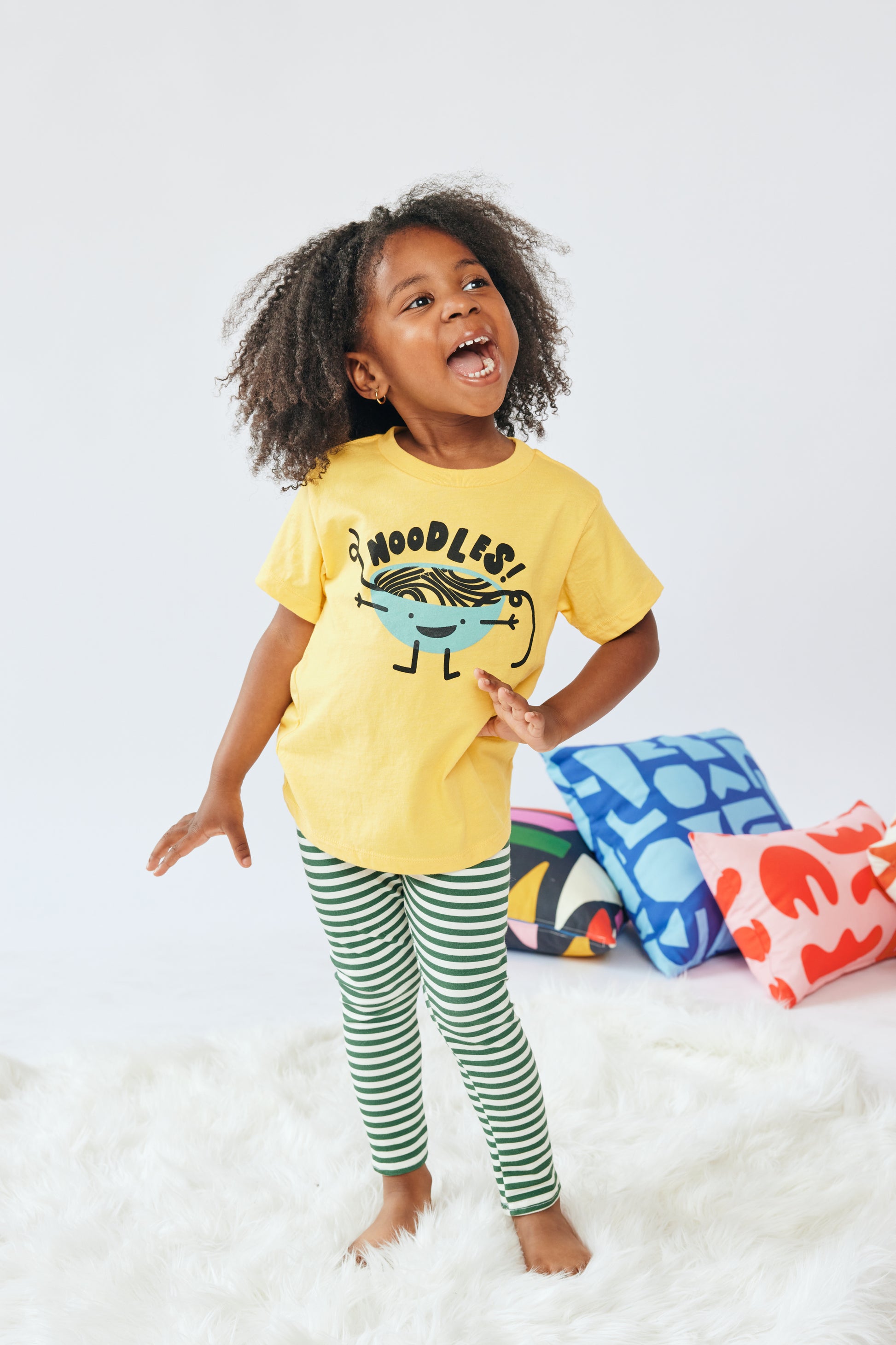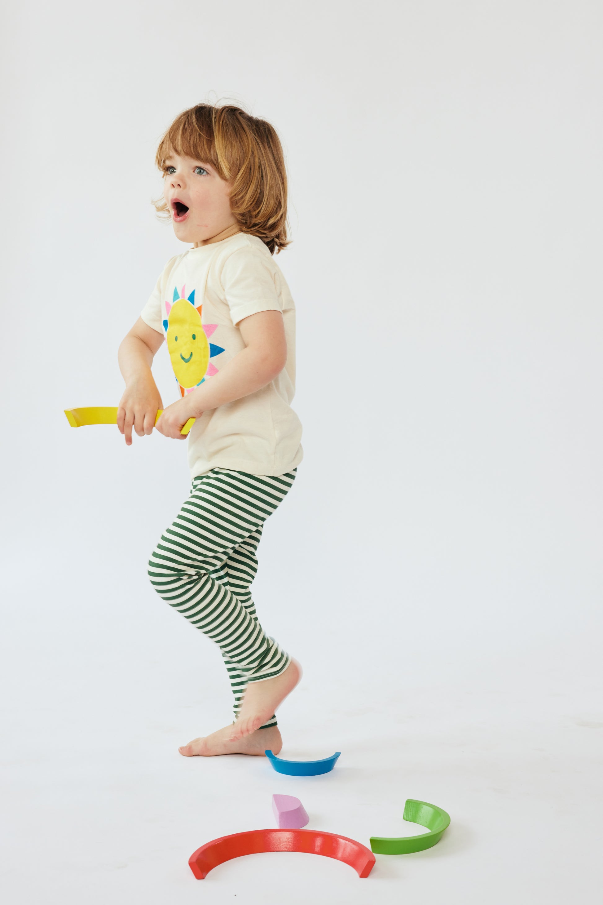 These organic green stripe leggings are easy to wear and literally go with anything. Completely gender-neutral because all colors are for everyone. These pants are part of our ongoing collaboration with Chicago brand Earth Cadets