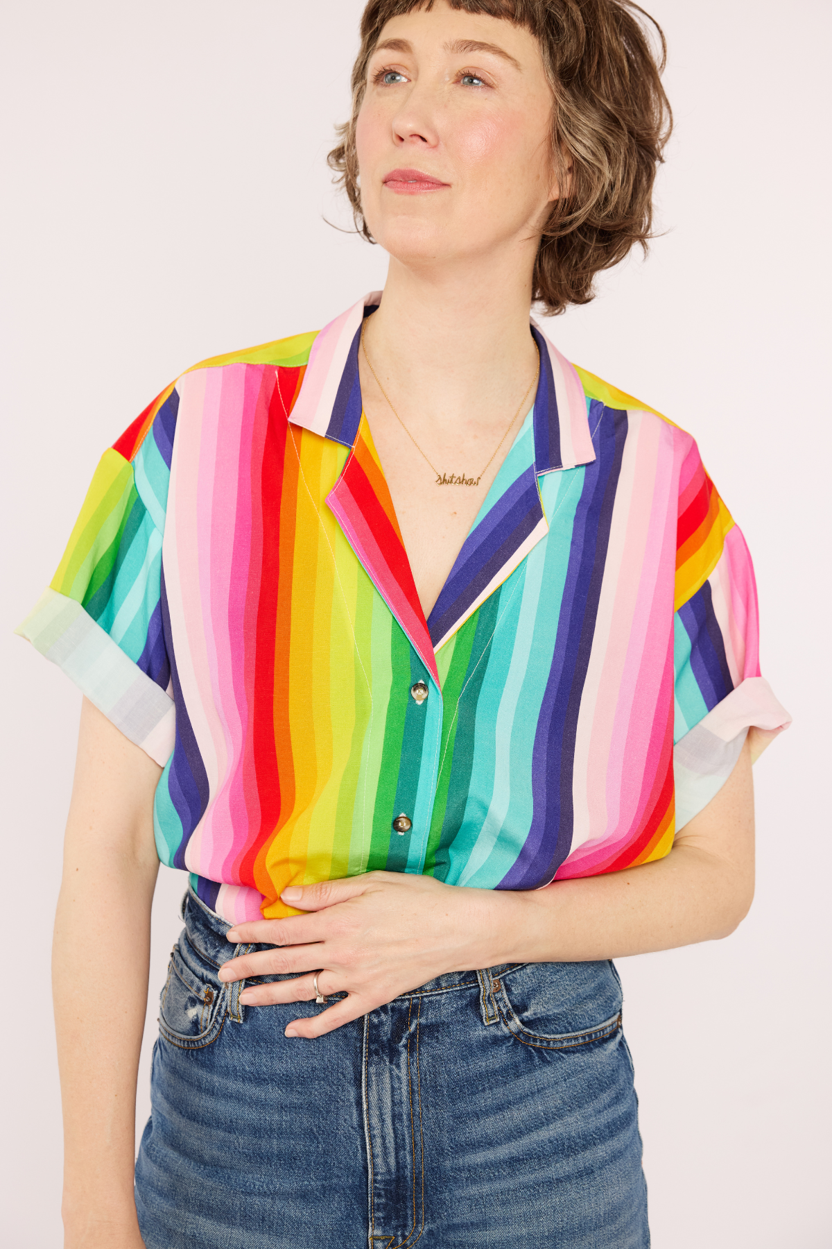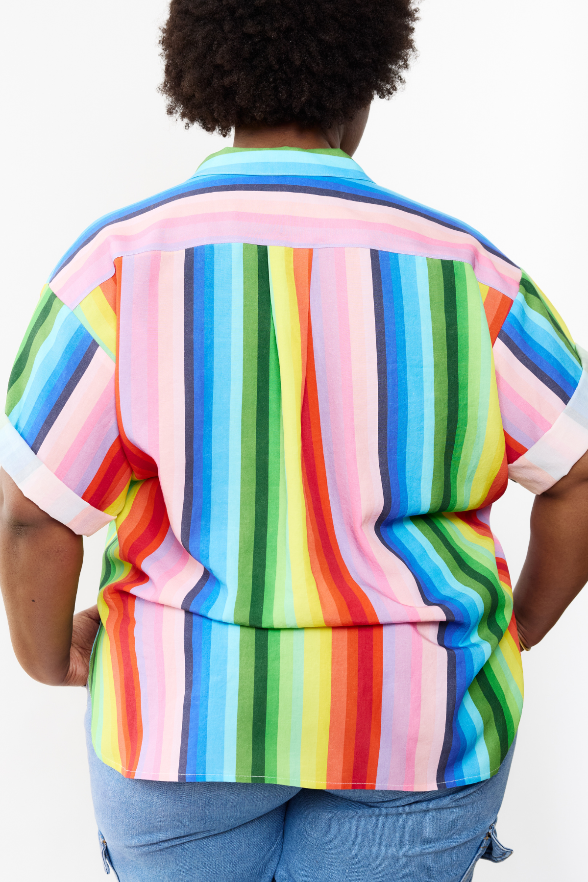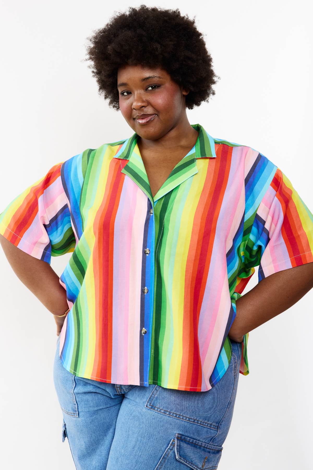 Why be boring? This colorful and bold button down will brighten your wardrobe AND your day! Easy to layer under a cardigan or blazer.