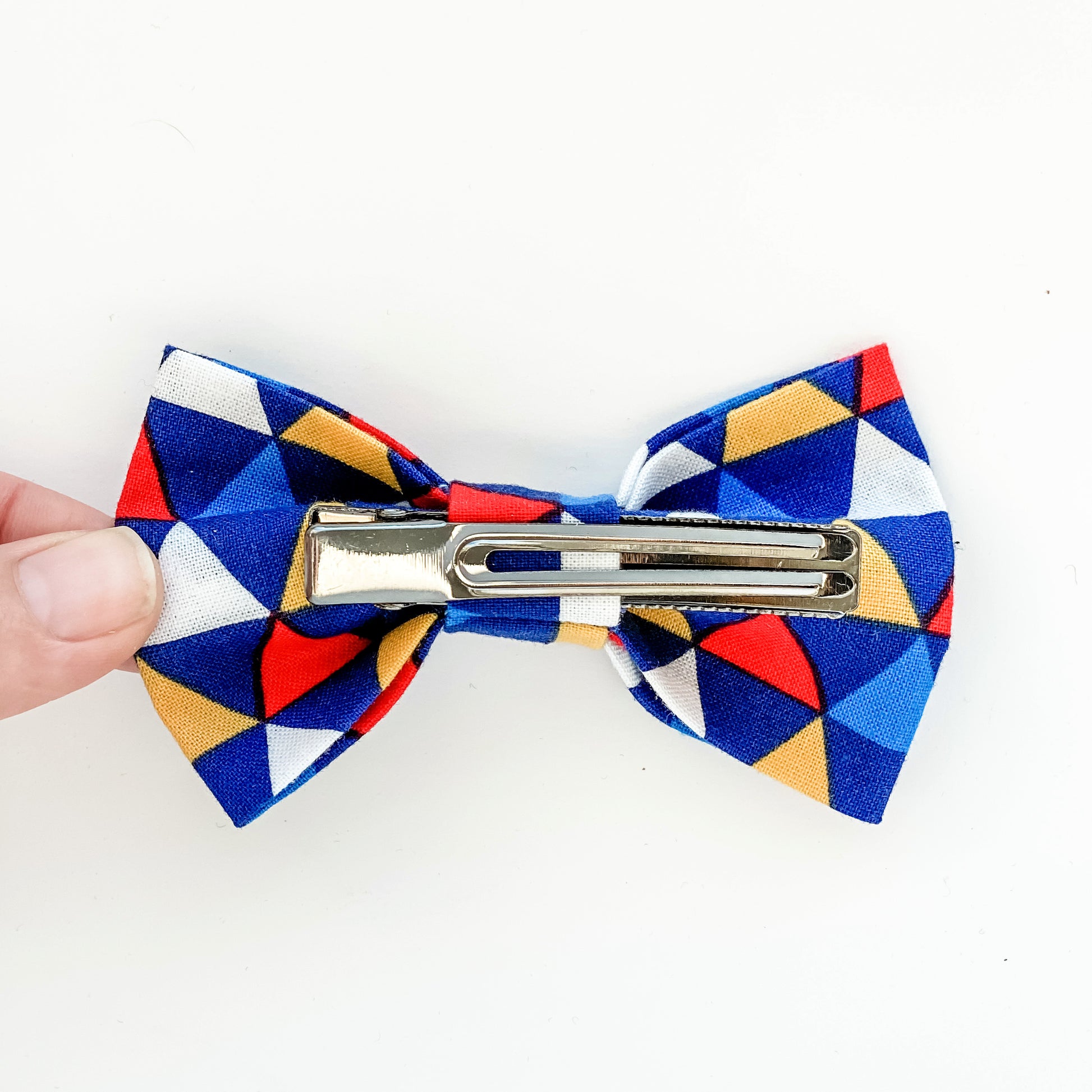 You can use this medium-sized bow as a hair clip OR a bow tie. Clips on with a 2.5" metal alligator clip.