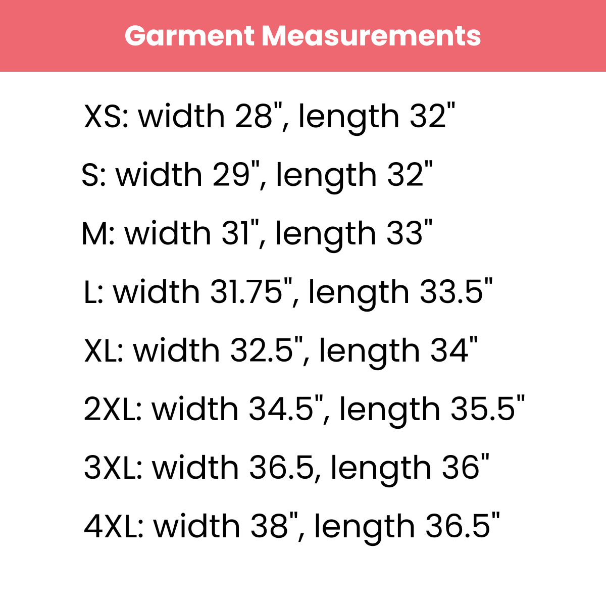 Available in sizes: XS, S, M, L, XL, 2X, 3X, 4X. Boxy/oversized fit.